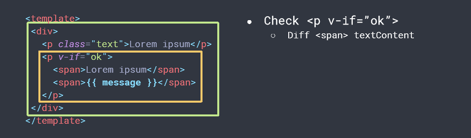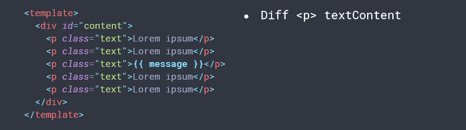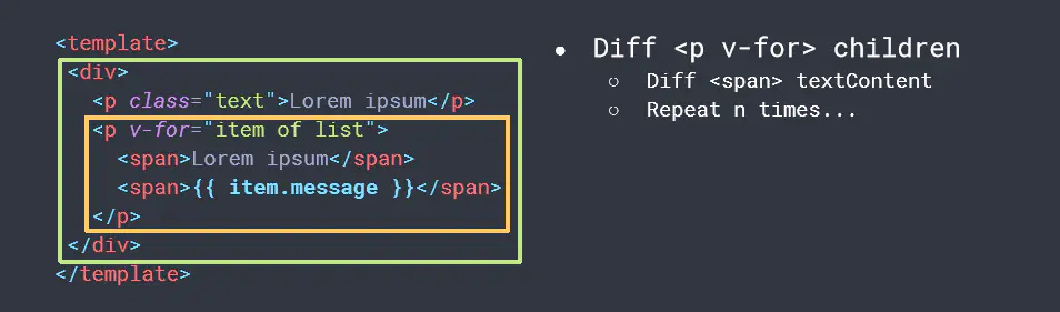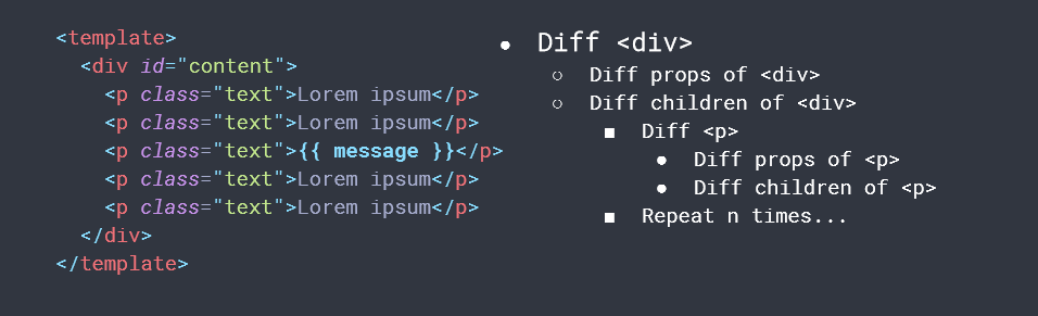 虽然Vue能够保证触发更新的组件最小化,但是单个组件内部依然需要遍历该组件的整个Virtual DOM树。如下图所示,template中,只有message插值部分发生改变,整体结构不变,但是数据更新的时候,比对整个template结构,这样就存在性能损耗。