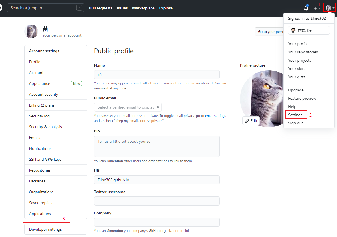 登录 GitHub,点击图像,选择 Settings,点击 Developer settings,如图所示: