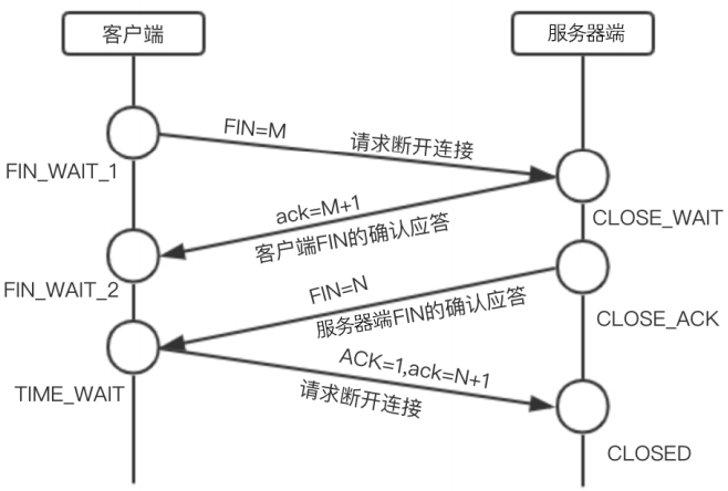 • 当服务器端收到客户端的FIN报文后,会先发送 ack=M+1 的确认,告知客户端关闭请求已收到,但可能由于服务器端还有未完成的数据传递,所以请客户端继续等待。